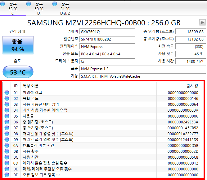 → 사용 시간(Power-On Hours), 재할당 섹터 수, 건강 상태(Good/ Caution/ Bad)를 반드시 확인하세요. 사용 시간이 25만 시간에 근접했거나 Bad 상태이면 구매를 재고하는 것이 좋습니다.