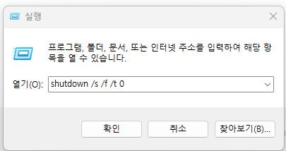 - Win+R -> shutdown /s /f /t 0 명령어 입력